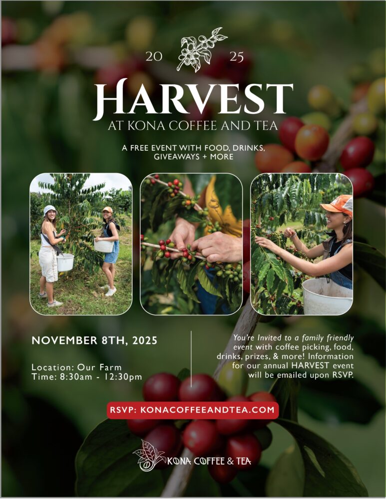 Come & join us for an educational farm experience, great for all ages! Come and see how our coffee is grown and help us celebrate the harvest season and celebrate 29 years of Kona Coffee & Tea! Free entry with $10 festival button for those over the age of 12.